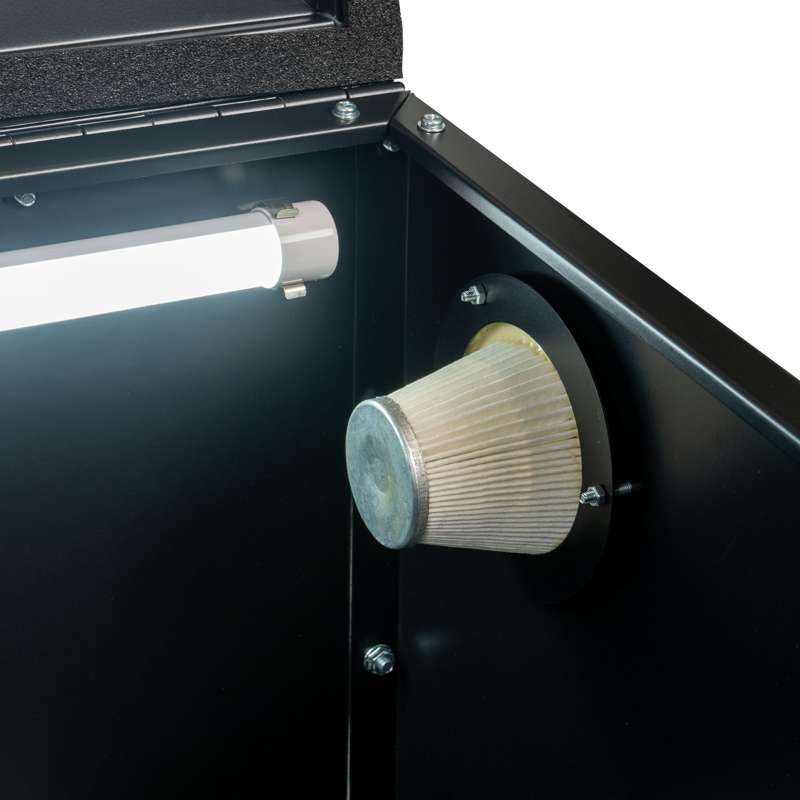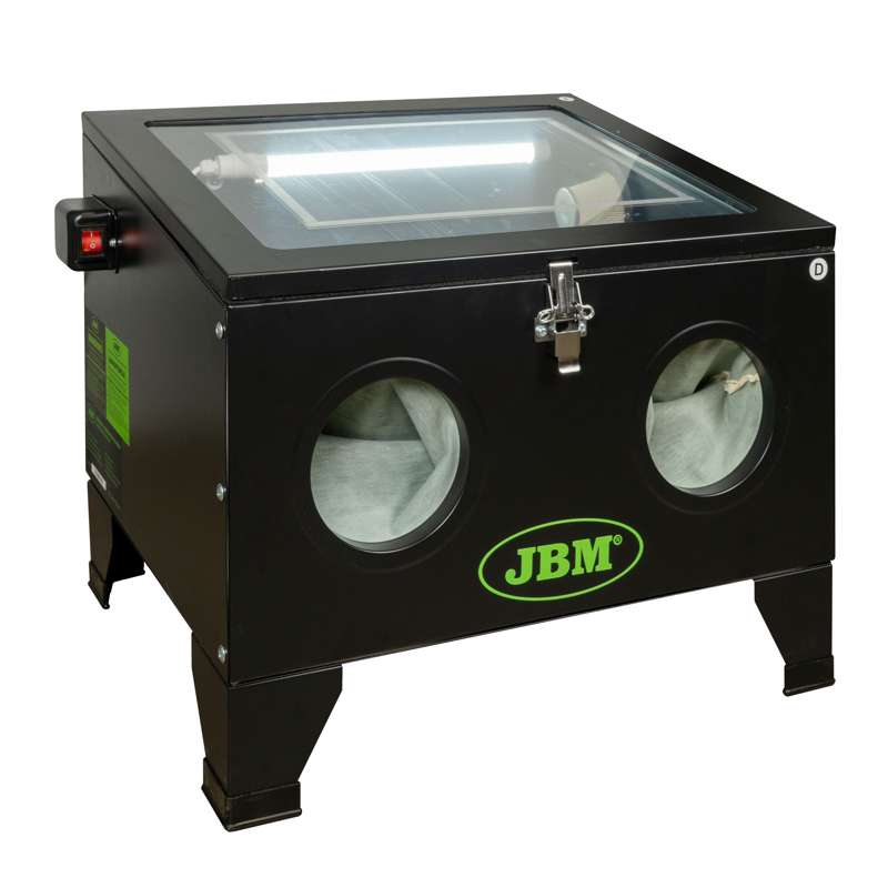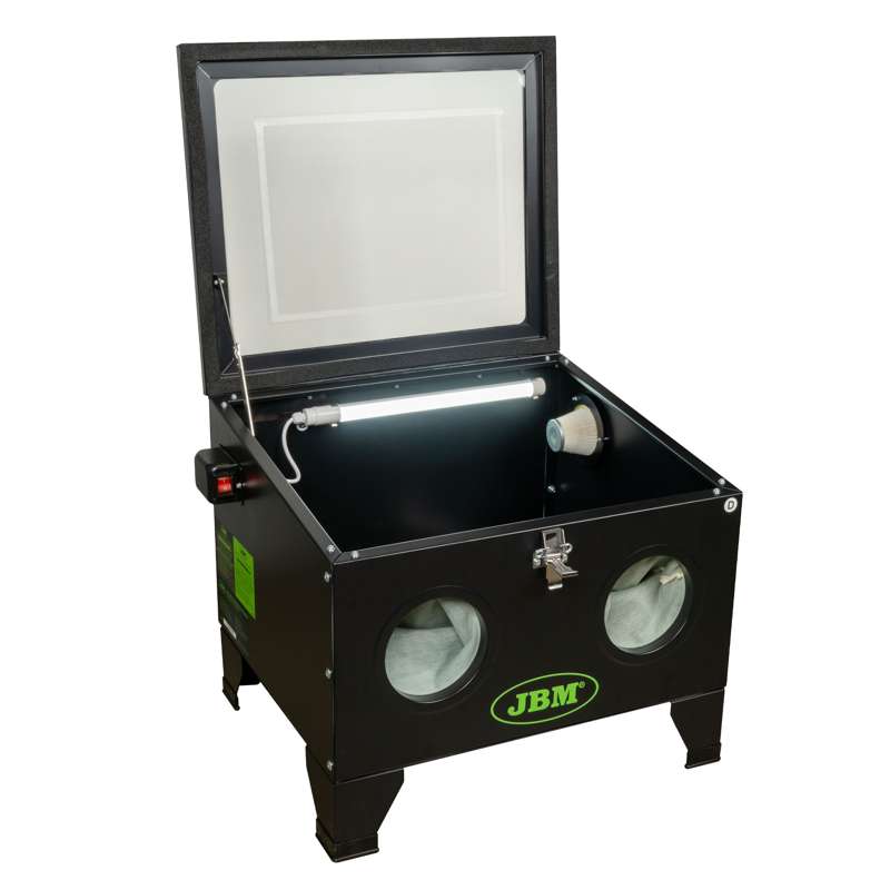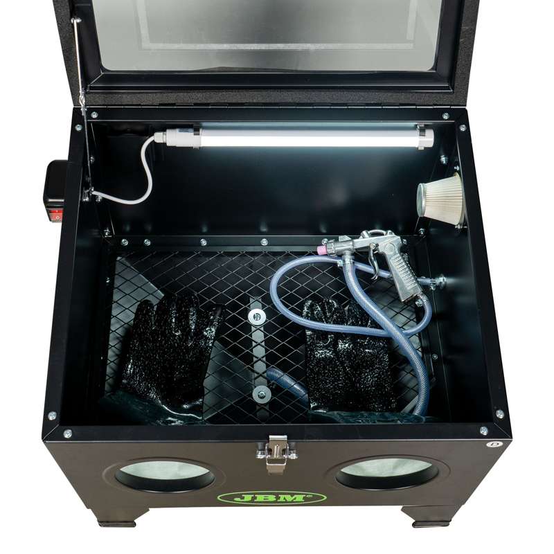 Ideel til afrensning af rust og maling for at rense metal, træ og sten overflader. Maskinen er med korte ben, beregnet til at stå på filebænk eller arbejdsbord. Den har et rumfang på 90L.