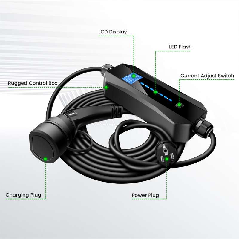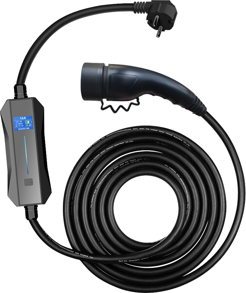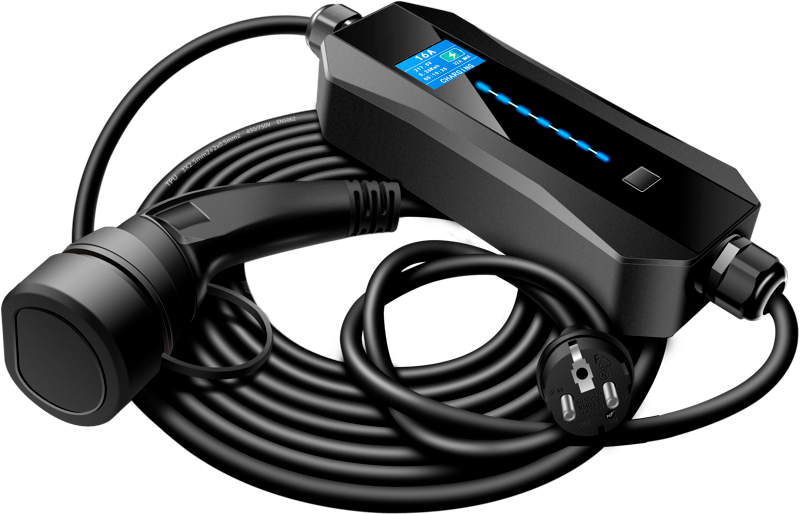 Smart handy lader til elbiler med (Schuko) EU-stik og type 2 stik til bilen. Bemærk at det er vigtigt kun at anvende 6A i almindelige husholdningsstik, og at denne type lader kun bør anvendes til nødladning. Du kan følge ladningen på laderens smarte LCD display.