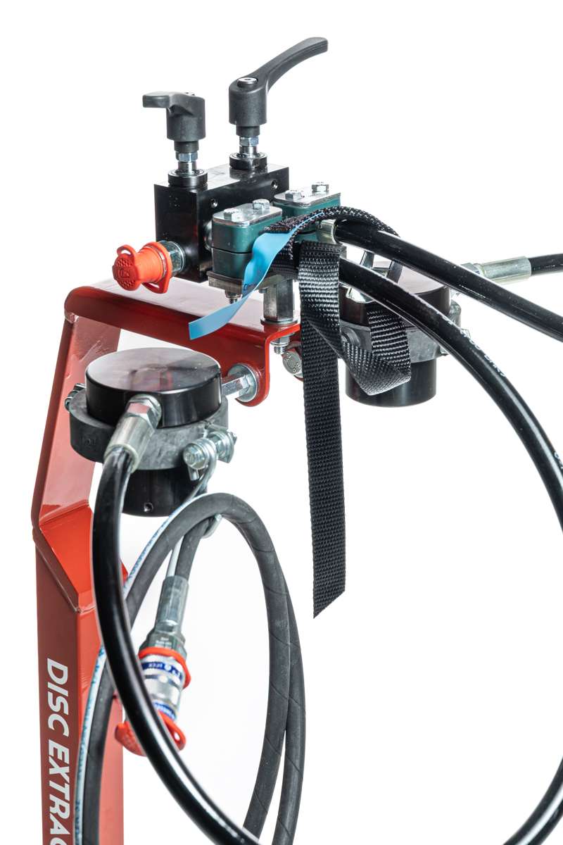 Værktøjet bruger kontrolleret aksial hydraulisk kraft til gradvist at “gå” bremseskiven af navet. De to hydrauliske cylindre og den tværgående trykventil sikrer jævn afmontering ét punkt ad gangen – helt uden varme, hammer, presse eller risiko for skade på navet.