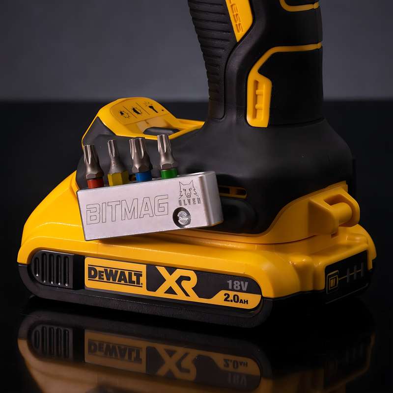 Bitmag er et smart produkt der holder 5 stk. bits eller bor (både lange og korte). Produktet sættes direkte fast til boremaskinen i siden, via boremaskinens egen skrue eller en af de medfølgende skruer. Du kan også anvende stærk dobbeltklæbende tape til at fastgøre produktet med. Slip for at rode efter bits i lommer og skuffer, med Bitmag har du dem altid lige ved hånden. Bitsene snapper hurtigt i holderen med den indbyggede magnet og de er lette at få ud med blot én hånd uden at skulle tage arbejdshandskerne af først.