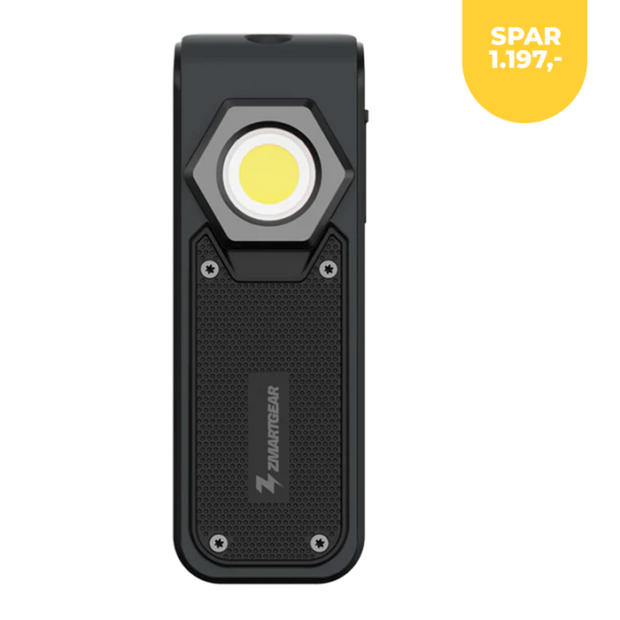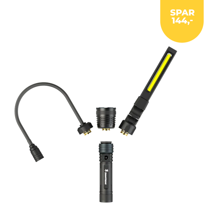 Smart lommelygte fra Zmartgearkit med forskellige lygter herunder zoom lygtehoved, slim LED stav og fleksibel LED.