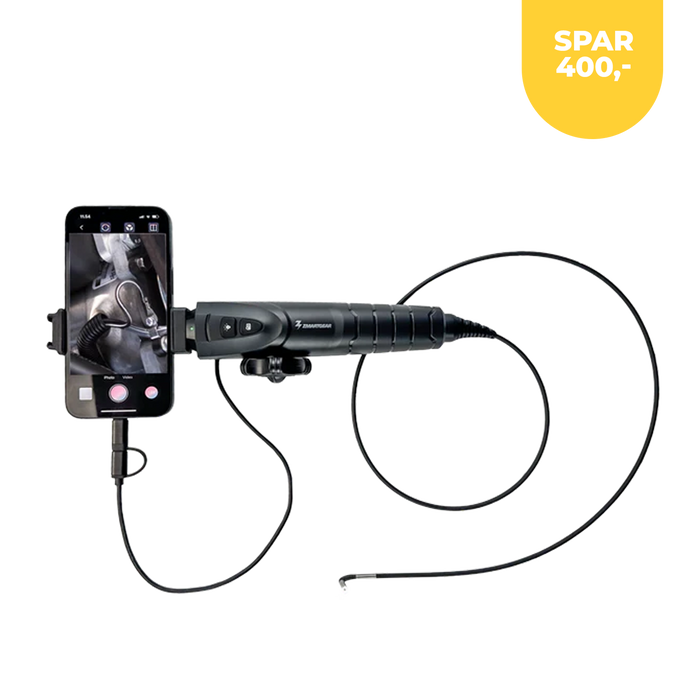 Avanceret inspektionskamera fra Zmartgear som bruges med smartphone, 360° justerbar probe, IP67-vandtæthed og nat-visning.